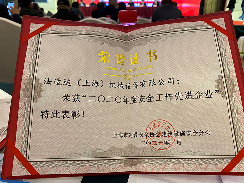 法適達(dá)公司榮獲上海市建設(shè)安全協(xié)會(huì)建筑設(shè)施安全分會(huì)頒發(fā)的安全工作先進(jìn)企業(yè)以及個(gè)人先進(jìn)。